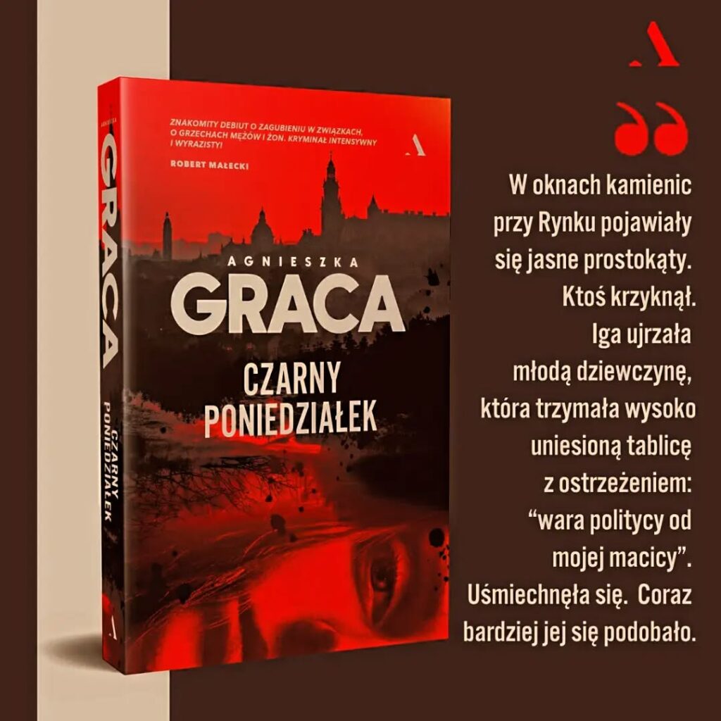 Pisząc Czarny Poniedziałek, nie myślałam kategoriami nośności tematu, nie chodziło o chłodną kalkulację: co się lepiej sprzeda, czy co się bardziej spodoba. Po pierwsze, chciałam napisać kryminał. Co do gatunku, nie było wątpliwości – to moja ogromna pasja, zatem musiał to być kryminał. Dość szybko poszło wymyślanie głównych bohaterów – pary detektywów i scenografii. Długo jednak nie mogłam znaleźć właściwej intrygi. Pomysł przyszedł trzeciego października 2016 roku, kiedy poszłam na Strajk Kobiet. To właśnie wtedy pomyślałam, że ofiarą mogłaby być kobieta, która wraca z Czarnego Protestu, a kilka godzin później zostaje znaleziona martwa. Wszystko kliknęło. Miałam pomysł, który mogłam rozwijać, a temat łamania praw kobiet, który jest dla mnie bardzo ważny, okazał się idealnym, pasującym do tej historii tłem powieści.